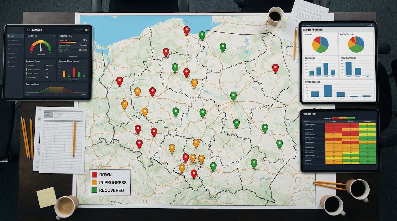 8 strategic leadership exercises analyzing the December 2025 Poland energy sector attack from a security management perspective. Covers risk assessment, threat intelligence, IT/OT governance, cyber insurance, OT security program design, detection investment, regulatory compliance, and executive crisis simulation. 10–14 hour