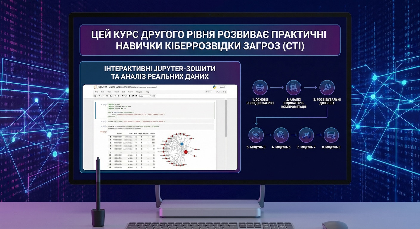 8-module hands-on course with Python-based Jupyter notebook exercises. Covers frameworks, MITRE ATT&CK, TTPs, intelligence lifecycle, IOCs, and analytical methods.
